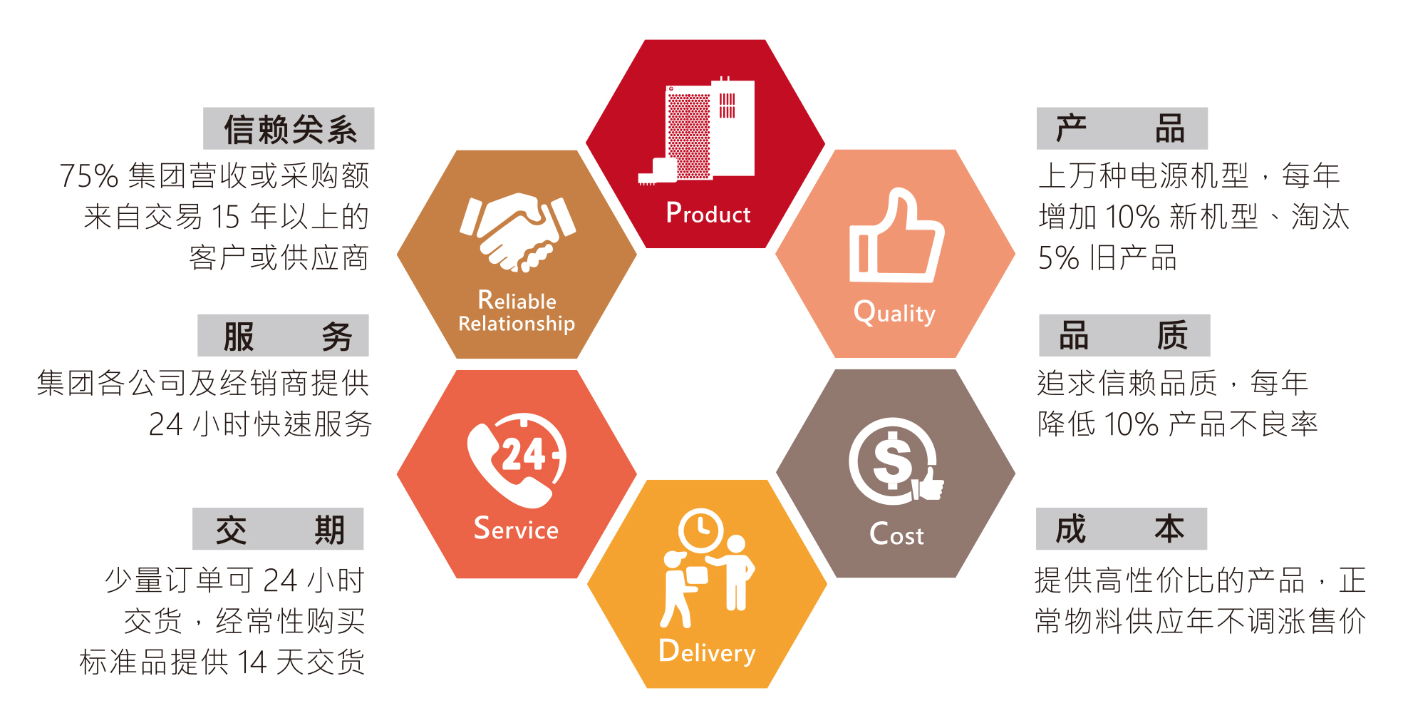 - 提供客戶/經銷商一次購足的電源解決方案(One Stop Shopping & Total solution)