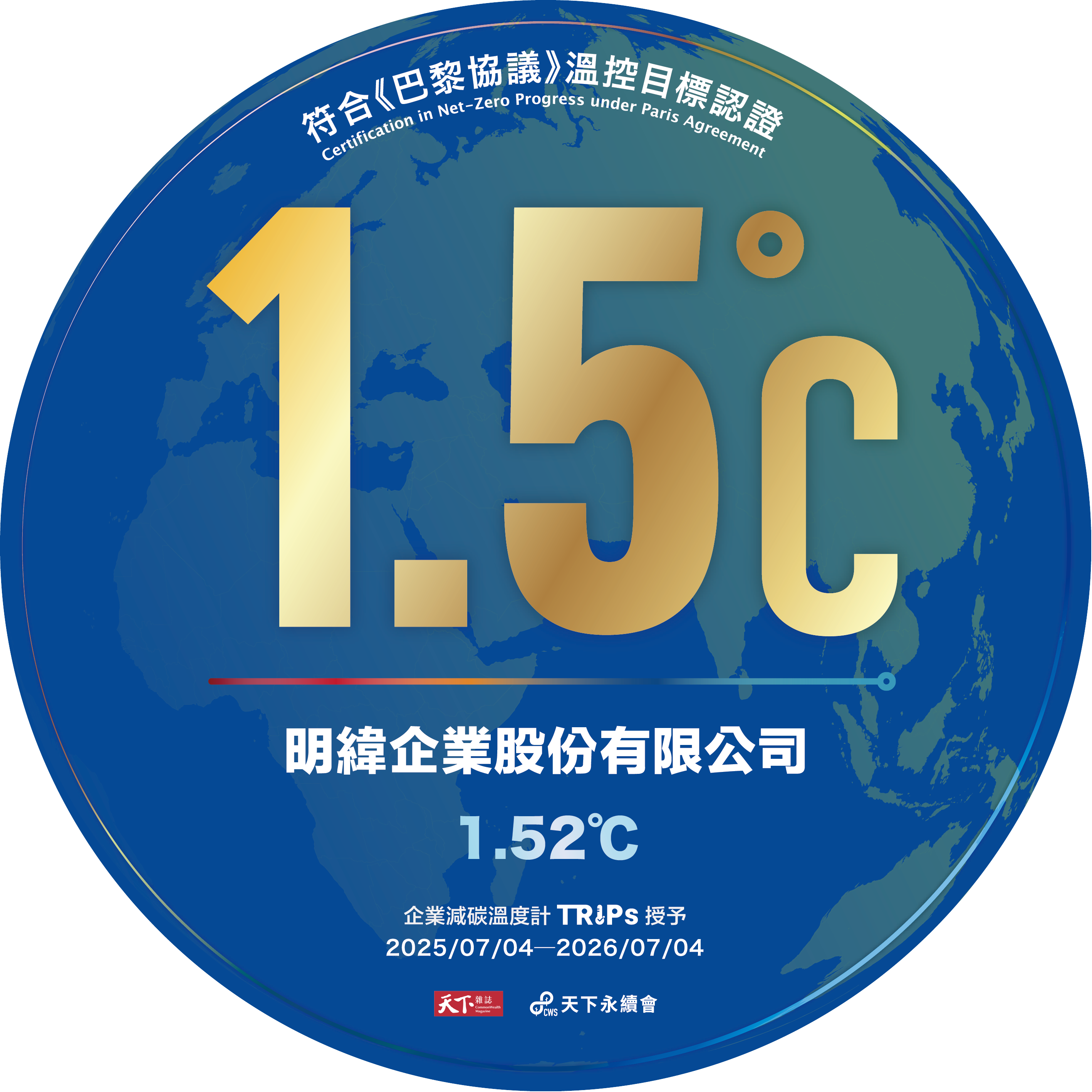 - 天下企業減碳溫度計–溫控1.521°C成效卓越標章