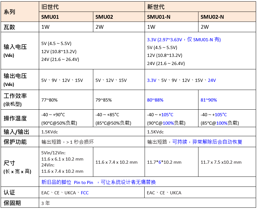 為讓用戶對于新舊品規格差異能快速了解與選型,詳如下表請參考: