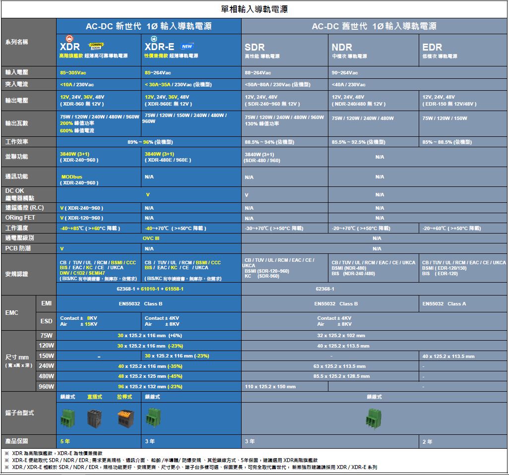 XDR-E 系列:75W~960W 全新世代 1? 輸入超薄性價兼備導軌電源