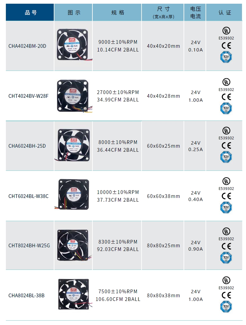 為因應更多元應用場域的電壓需求,聯源精密在既有12V DC風扇產品線的基礎上,正式推出明緯品牌24V DC風扇 — CH系列。