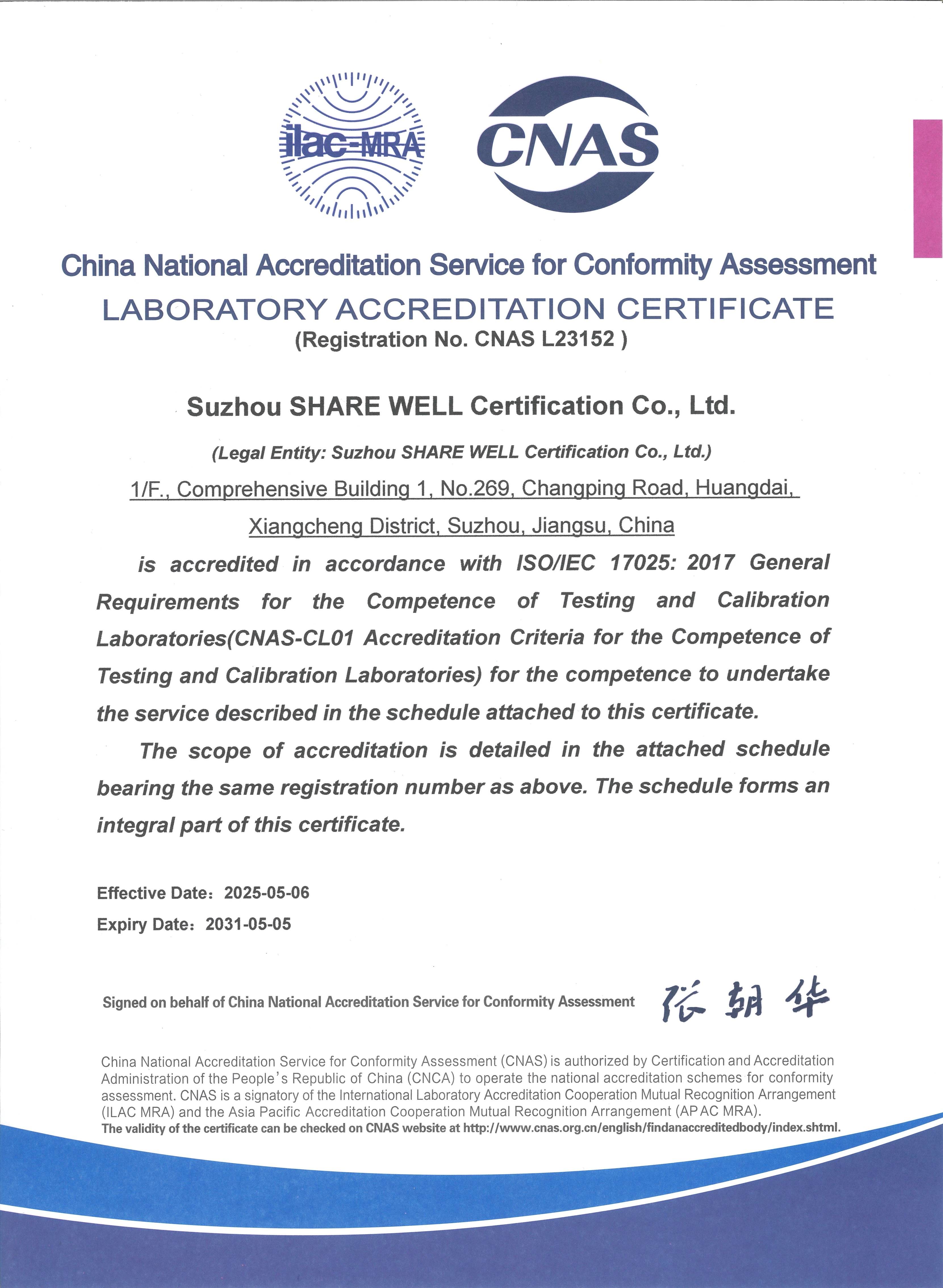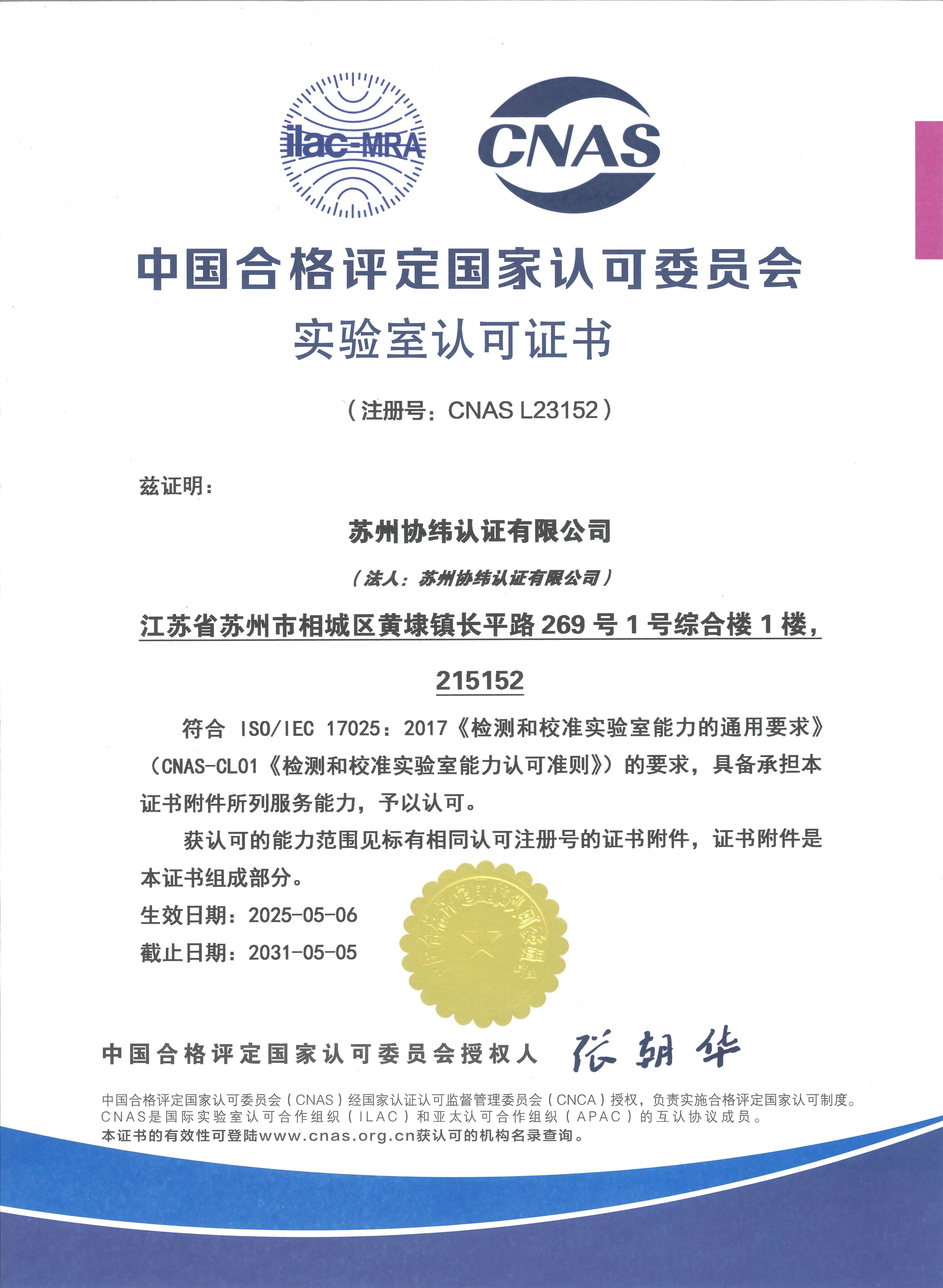 2025年5月6日蘇州協緯認證有限公司正式獲得中國合格評定國家認可委員會(CNAS)頒發的實驗室認可證書(注冊號:CNAS L23152)。這標志著該實驗室在電磁兼容檢測領域的技術能力和質量管理體系已達到國際水平。