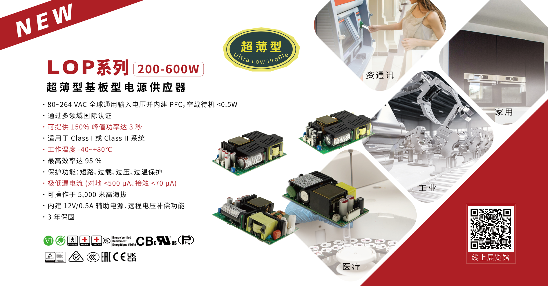 明緯超薄基板型LOP系列,功率涵蓋200~600W,5" x 3" 尺寸下功率可至 600W、具備 150% @ 3 秒供載能力、-40~+80℃更寬工作溫度,同樣通過多領域國際認證,適用于資通訊、醫療、工業、家居行業。
