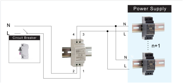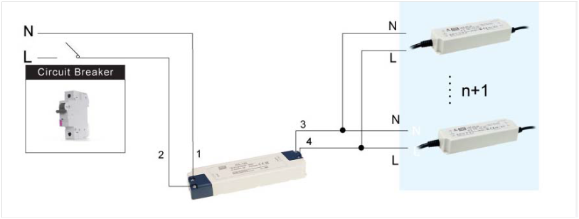 并接多臺明緯電源供應器時,應慎選合適的斷路器,以避免一開機斷路器即跳脫保護;若實在并接太多臺而無法挑選合適的單一斷路器,此時應考慮使用多個斷路器分路保護。