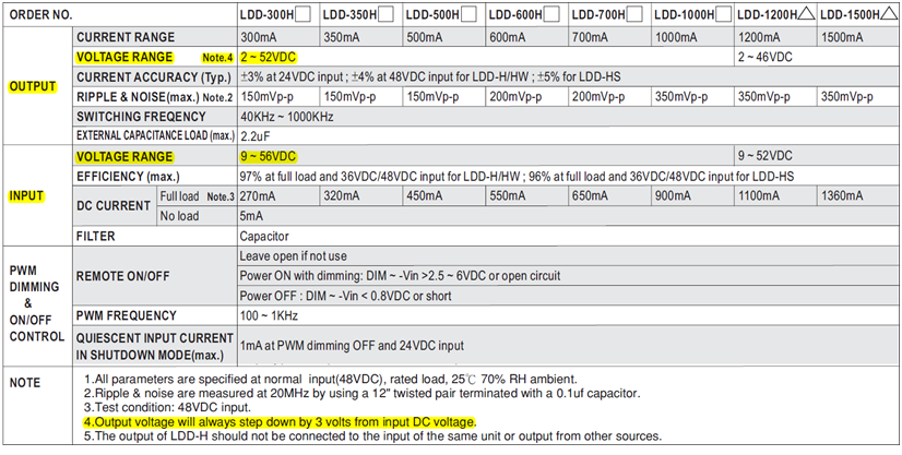 以LDD-350H的規格來解釋說明,LDD-350H的輸出電流為350mA,輸出與輸入電壓范圍分別是: 輸入9~56VDC,輸出2~52VDC。實際輸出電壓由LED負載決定,而輸入電壓只要是比輸出電壓高3V都是可操作范圍。意思是當LED順向偏壓是9V,則LDD-350H輸入在12~56VDC范圍都會正常工作。
