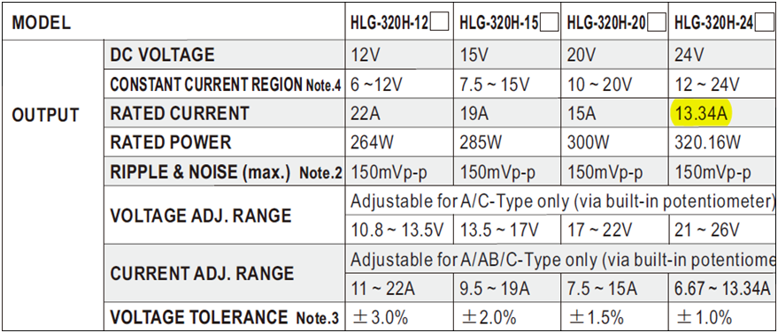 增加電流可藉由直接增加瓦數,比如說HLG-320H-24換成HLG-480H-24,或是換成低壓(高電流)同功率產品,比如說 HLG-320H-24 (13.34A)換HLG-320H-12 (22A),必須注意選用的電壓必須是在電壓-電流轉換器的輸入范圍內。
