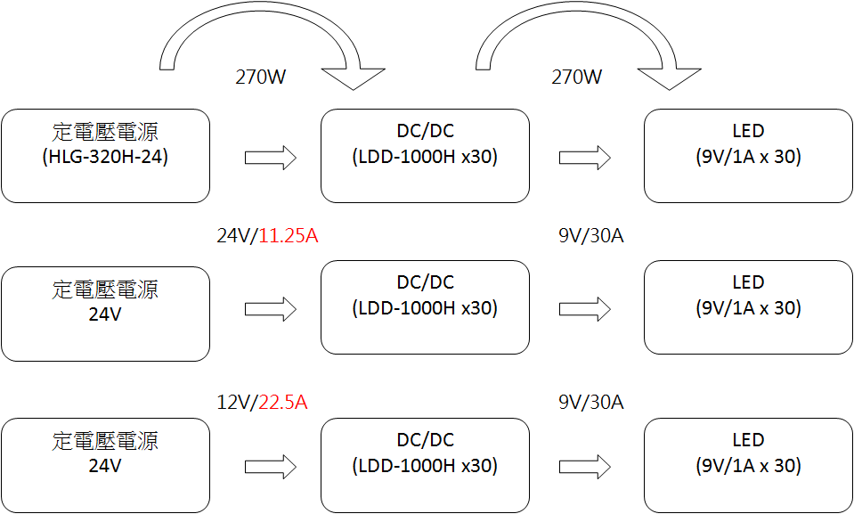 主因為電流轉換器啟動電壓低于前端電源供應器的額定電壓,當在低壓啟動工作下,電流轉換器需求電流高于電源可輸出電流值。以圖三為例,輸出端燈條每條上的LED電壓電流是9V/1A,30條并聯時總輸出就是270W。如果燈具或轉換器輸入電壓標示為 24V 輸入,一般人可能會選 24V、大于300W的LED驅動器,比如說HLG-320H-24。