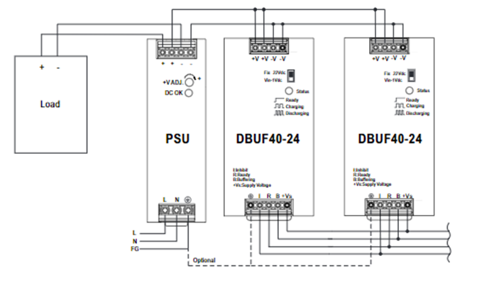 緩沖模組與不斷電系統有諸多差異,如表一。由于緩沖模組內部是由電容組成,因此,有著小型化、低成本且免維護等優點。此外,UPS有毫秒級的反應時間,相較之下,緩沖模組則無此問題。緩沖模組內部電容與電源輸出端采直接并聯的形式如圖三,當電源輸出失效時,緩沖模組內的電容可即時供電,讓客戶有足夠時間進行資料儲存。緩沖模組特別適用在資料處理相關設備,或者工業電腦供電設備。倘若終端設備負載量較大,或需較多時間儲存資料時,緩沖模組亦能并聯使用,如圖四。