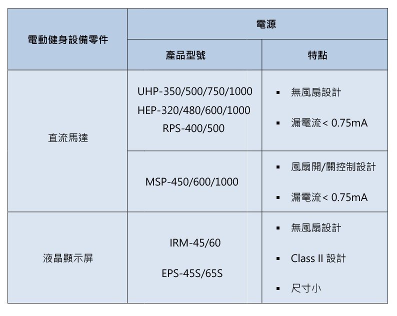 因此,電動健身設備需要無風扇或有風扇開/關控制功能和低漏電流的電源,在選擇電源時,建議考慮上述的需求。MEAN WELL產品線齊全,提供各種符合電動健身設備電源需求的產品型號,詳細產品信息可參考下表。