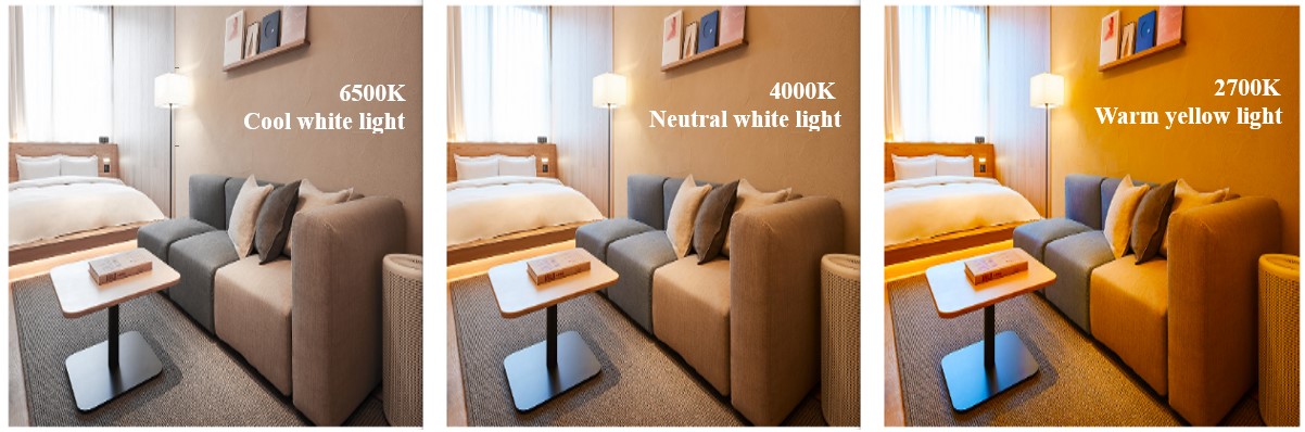 單一色溫的燈具并不能同時滿足人們的生活和工作需要,人們對光溫的需求會依不同的時間段而不一樣。如下圖二酒店房間照明,在白天,冷白光或中性白光更適合于閱讀和交流;到了晚上,溫暖的光可以緩解身心疲憊,改善睡眠質量。因此,以色溫可調的LED燈具將會越來越廣泛應用于住宅、酒店、辦公和其他商業照明場合,以提供個性化照明,滿足不同時段需求。