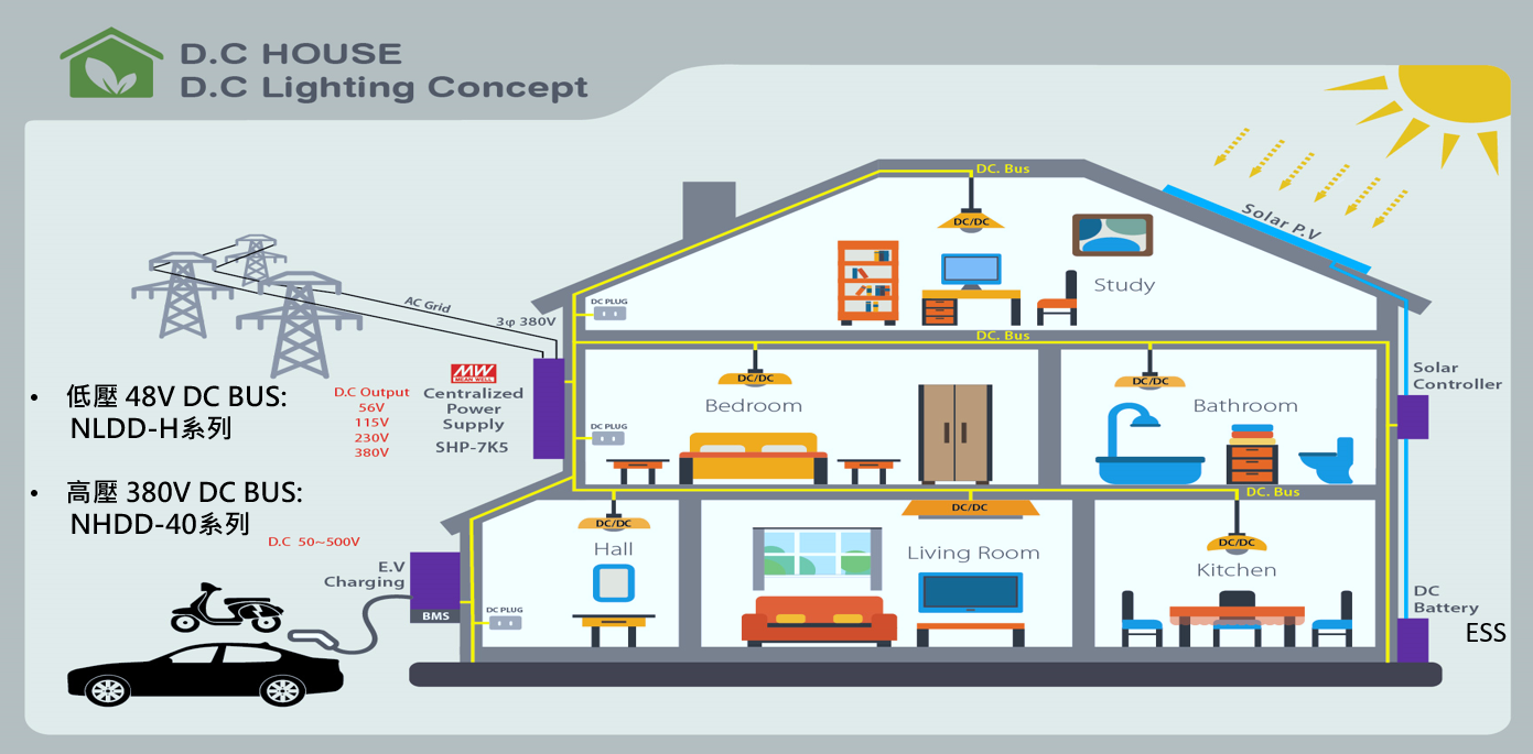 明緯期許成為標準電源標竿企業,除了致力于創新研發高效節能產品,也致力于研究友善環境與減少能耗的解決方案,并可結合未來綠能發電與儲能系統的應用,此外,電動車的發展也將帶動高壓直流輸出的應用,高壓直流其實可使用于多種工業應用場合,包含雷射切割/UV固化設備/電解設備及直流集中供電等應用,明緯也特別針對高壓直流集中供電照明提供完整方案,此次就特別先與大家分享,高壓直流集中供電照明的應用方式,后續會再依不同高壓應用方式提供介紹。